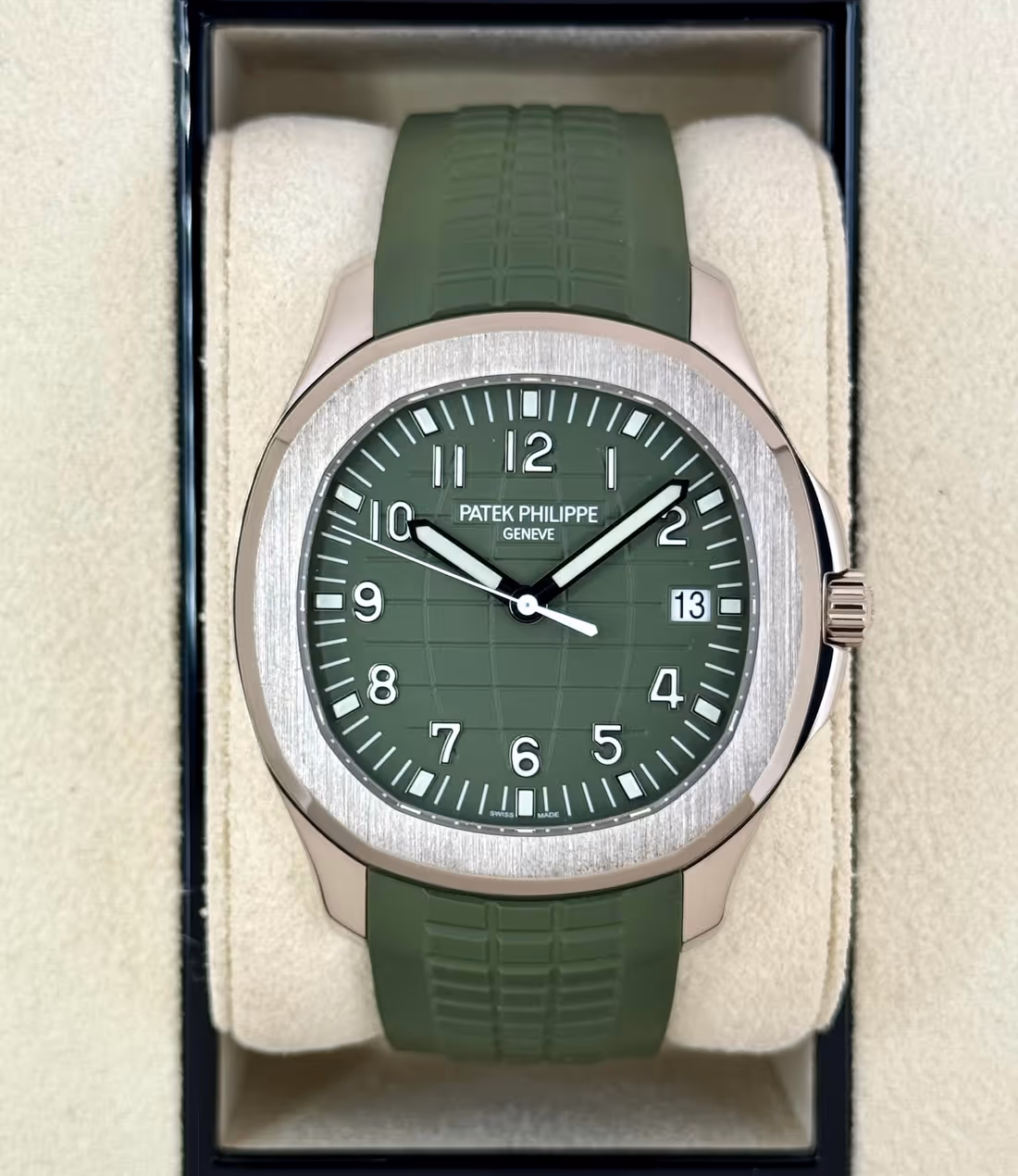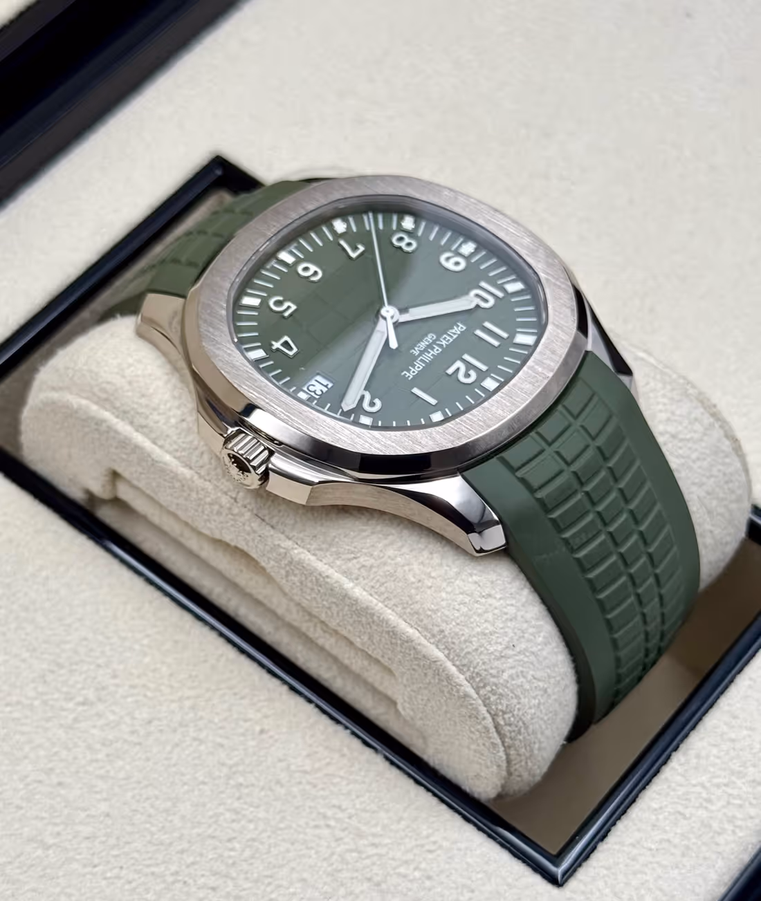 Khaki green embossed Aquanaut pattern with white gold applied numerals and luminescent coating